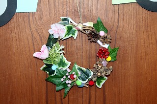 親子で自然物や春をイメージした造花を使い、自由にリースを